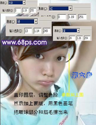6、新建一个图层,盖印图层,调整色阶,参数设置如下图,确定后加上图层蒙版,用黑色画笔把眼球部分和眉毛擦出来。