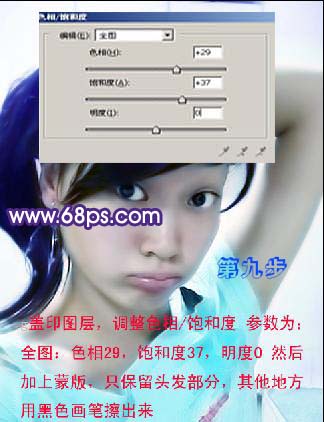 9、创建色相/饱和度调整图层,参数设置如下图,确定后用黑色画笔,之保留头发部分,其它地方擦掉。