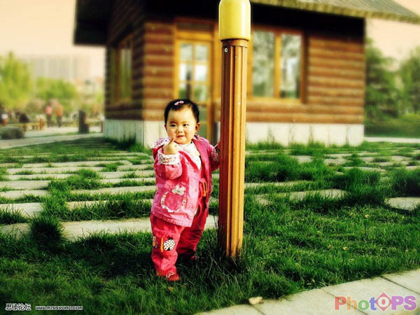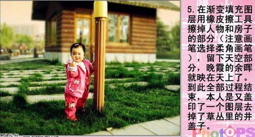 5、在渐变填充图层用橡皮工具擦掉人物和房子部分,完成最终效果。