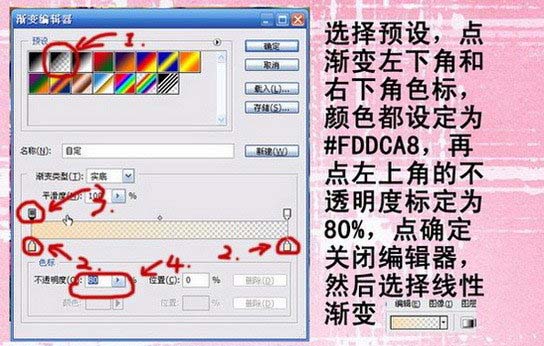 点渐变左下角和右下角色标颜色设置为:#FDDCA8,再点左上角的不透明度设为80%,点确定关闭编辑,选择线性渐变。