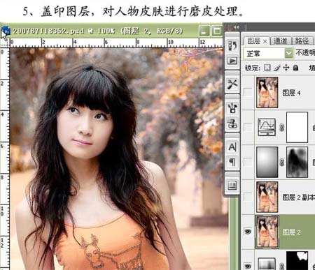 5、新建一个图层,盖印图层,对人物皮肤进行磨皮处理。