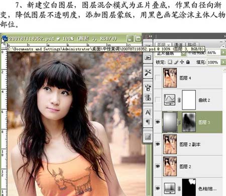 7、新建一个图层,图层混合模式改为“正片叠底”,选择渐变工具拉出有中心到周围的黑白径向渐变,然后把图层的不透明度改为:66%,加上图层蒙版用黑色画笔涂抹主体人物部位。
