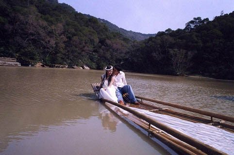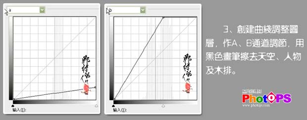 2、再创建曲线调整图层,参数设置如下图,确定后用黑色画笔把人物及木排擦出来。