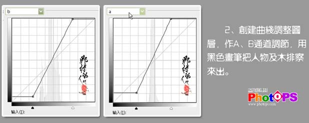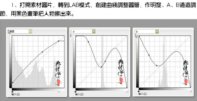 1、打开原图,选择菜单:图像 > 模式 > Lab颜色,确定后创建曲线调整图层,参数设置如下图。确定后用黑色画笔把人物部分擦出来。