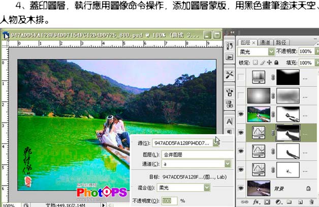 4、新建一个图层,按Ctrl + Alt + Shift + E盖印图层,执行:图像 > 应应用图像,参数设置如下图,确定后用黑色画笔把天空、人物及木排擦出来。