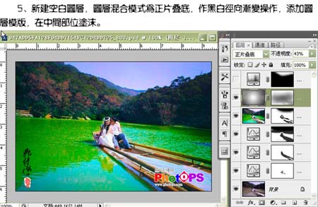 5、新建一个图层,图层混合模式改为“正片叠底”,选择渐变工具颜色设置为黑白径向渐变,然后拉出由中心到四周的径向渐变,确定后加上图层蒙版用黑色画笔把中间部分擦出来。