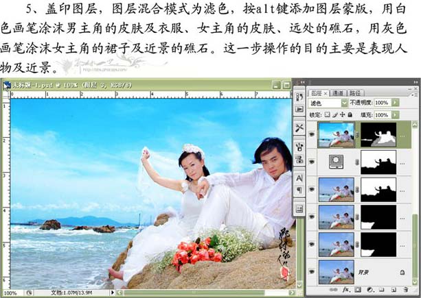 5、新建一个图层按Ctrl + Alt + Shift + E盖印图层,图层混合模式改为“滤色”,按Alt调加图层蒙版,用白色画笔涂抹男主角的皮肤及衣服,女主角的皮肤、原处的礁石,用灰色画笔涂抹女主角的裙子及近景的礁石。