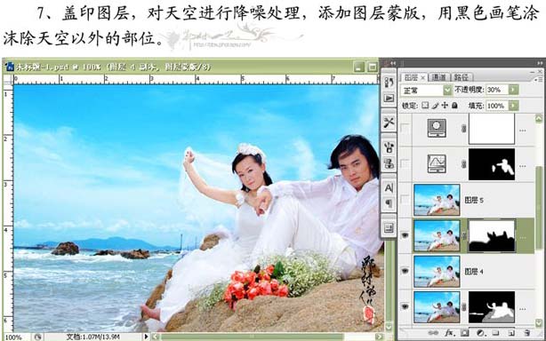 7、新建一个图层按Ctrl + Alt + Shift + E盖印图层,对填充进行降噪处理,填加图层蒙版,用黑色画笔涂抹除天空以外的部分。
