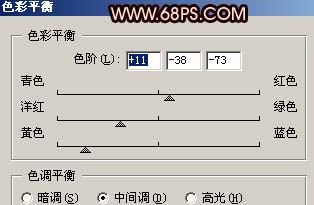 打开原图,创建色彩平衡调整图层,参数设置如图