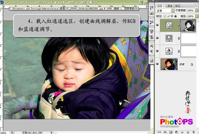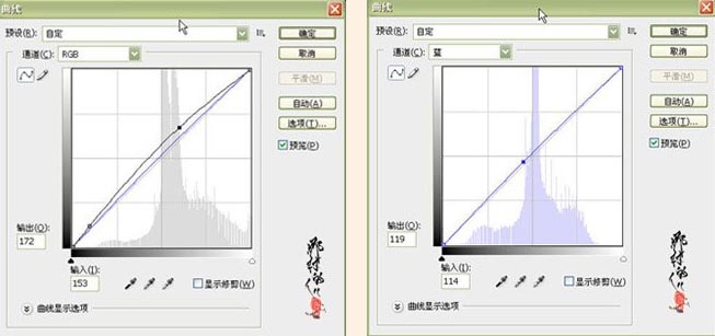 4.点通道面版按Ctrl 点红色通道调出选区,然后回到图层面版,新增调整图层选择曲线分别对RGB 和 蓝色通道调节参数设置如下图