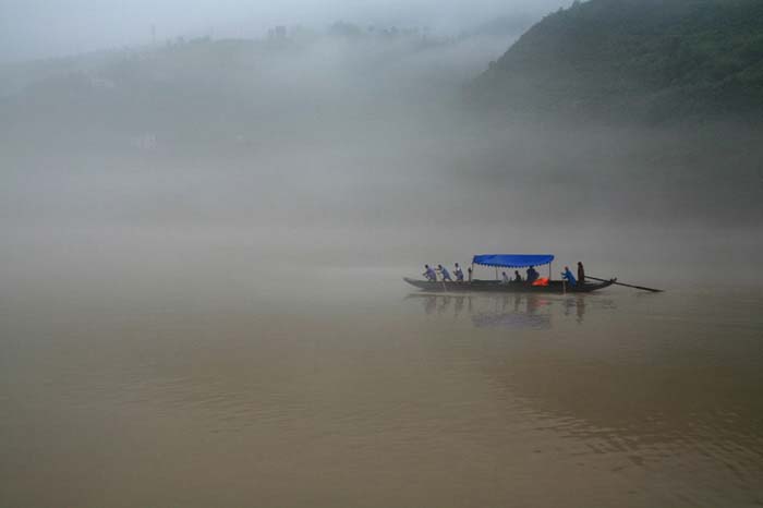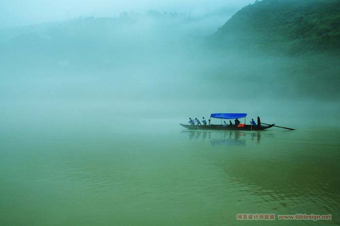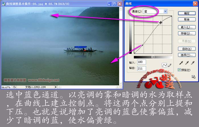 4、选中蓝色通道,以亮调的雾和暗调的水为取样点,在曲曲线上建立控制点,将这两个点分别上提和下压,也就是说增加了亮调的蓝色使雾偏蓝,减少了暗调的蓝,使水偏黄绿。