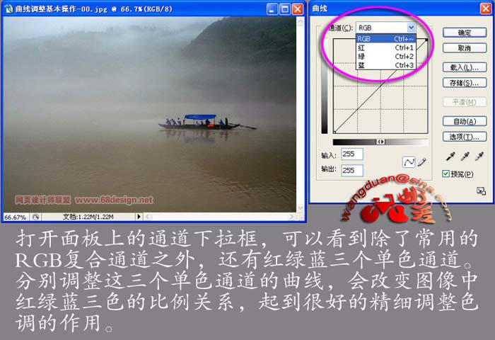 1、打开原图,按Ctrl+M打开曲线,面板上的通道下拉框,可以看到除了常用的RGB复合通道之外,还有红绿蓝三个单色通道,分别调整这三个单色通道的曲线,会改变图像中红绿蓝三色的比例关系,起到很好的精细调整色调的作用。