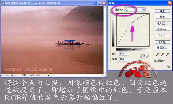 2、将这个点向上提,图像颜色偏红色,因为红色通道被提亮了,即增加了图像中的红色,于是原本RGB等值的灰色云雾开始偏红了。
