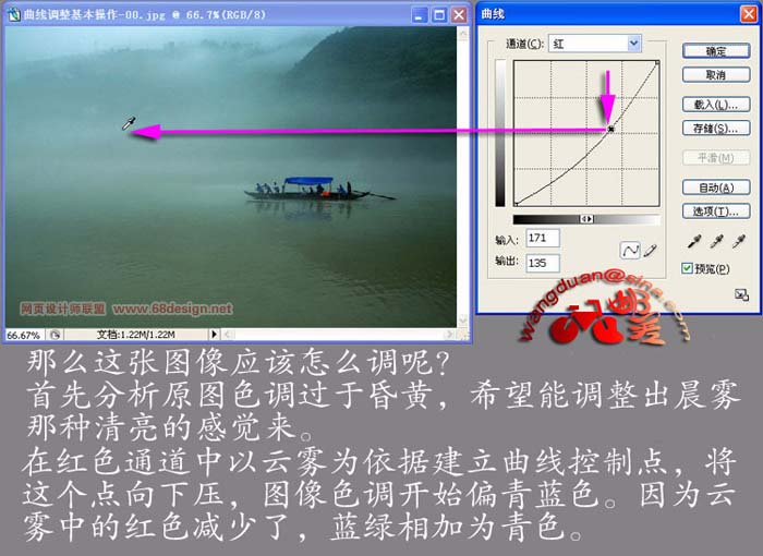 3、那么这张图像应该怎么调呢?首选分析原图色调过于昏黄,希望能调整出晨雾那种清亮的感觉来,在红色通道中以云雾为依据建立曲线控制点,将这个点向下压,图像色调开始偏青蓝色,因为云雾中的红色减少了,蓝绿相加为青色。