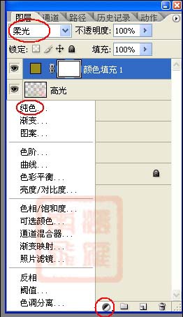 13、创建纯色调整层,点图层面板下面的红色圈,把混合模式为柔光。