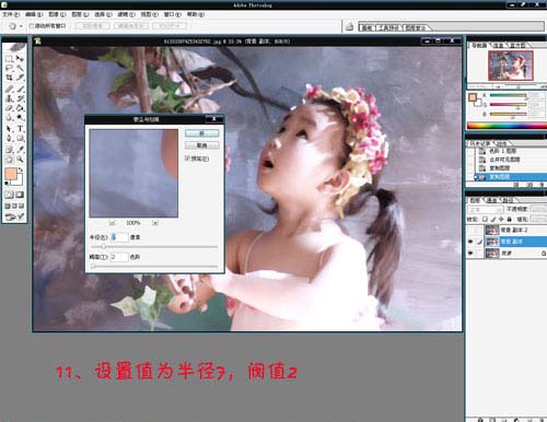 11、添加杂色滤镜的参数的设置,半径3,阈值2。