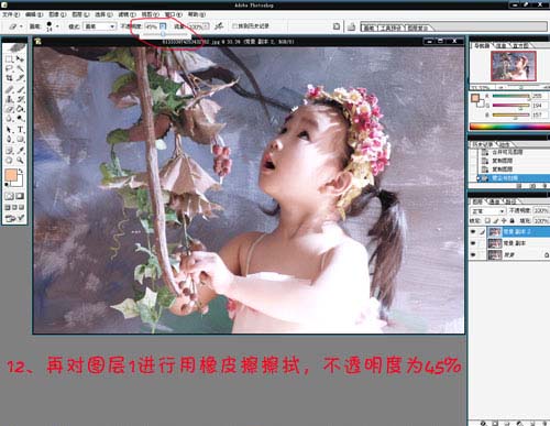 12、再对背景副本2图层,用橡皮擦擦拭,设置不透旷工为45。