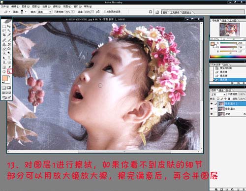 13、对背景副本2进行擦拭,如果你看不到皮肤的细节部分,可以用放大镜放大擦,擦完满意后,再合并图层。