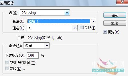 2、接着转到Lab颜色,图像—模式—Lab颜色,执行应用图像,图层:图层1,通道a,混合:柔光,不透明度100%;然后转回RGB颜色。