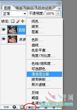 4、点击图层面板下的,创建新的填充或调整图层按钮,选择通道混合器。