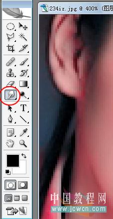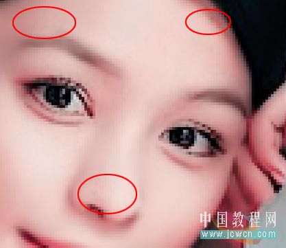 18、这时我们用放大镜放大2-3倍,可以看到人物的脸部有些小色点, 这是因为运用了变暗混合模式和高反差保留的结果,所以咱们用涂抹工具来进行擦除;