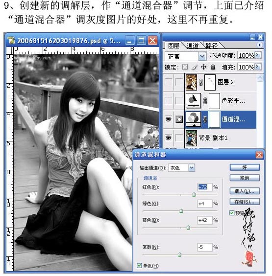 9、创建新调解层,作“通道混合器”调节,上面己介绍“通道混合器”调灰度图片的好处,这里不再重复。