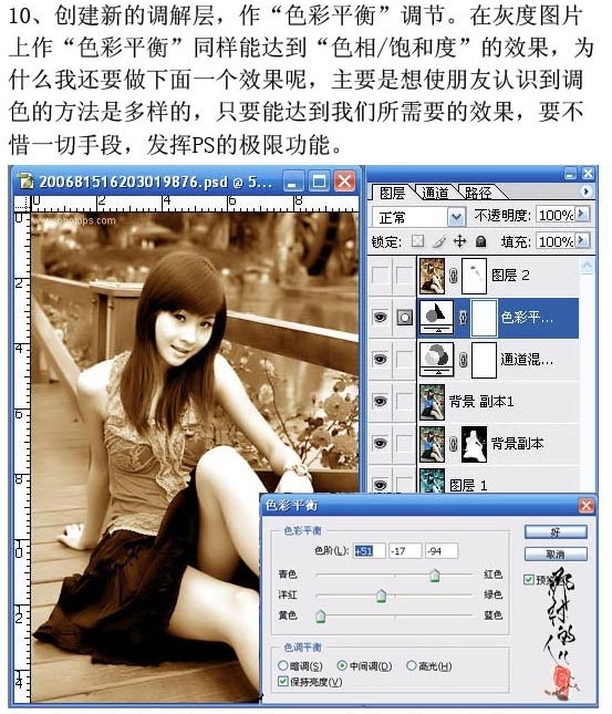 10、创建新调解层,作“色彩平衡”调节,上灰度图片上作“色彩平衡”同样能达到“色相/饮和度”的效果,为什么我还要做下面的效果呢,主要是想使朋友认识到调色的方法是多样的,只要能达到我们所需要的效果,要不惜一切手段,发挥PS的杉限功能。