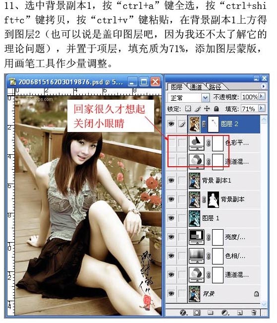 11、选中背景副本1,按“ctrl+a”键全选,按“ctrl+shif+c”键抟贝,按"ctrl+v"粘贴,在背景副本1上方得到图层2(也可说盖印图层吧,因为我还不太了解它的理论问题),并置于顶层,填充降质为71%,添加图层蒙版,用画笔工具作少量调整。