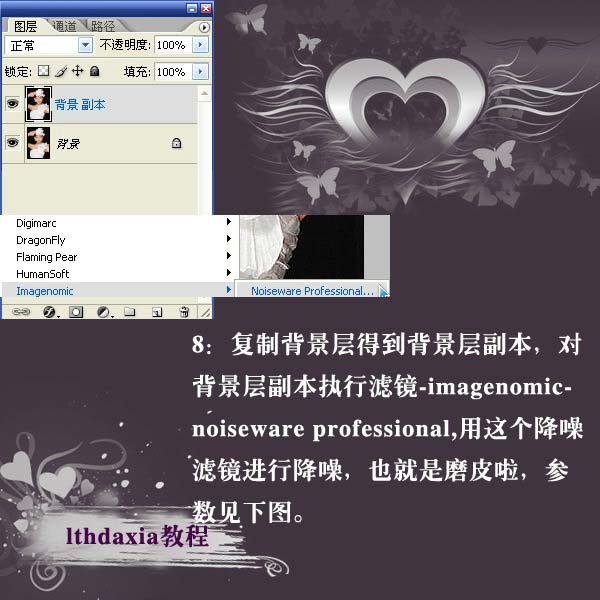 8、复制背景图层得到背景层副本,对背景层副本执行滤镜-imagenomic-noiseware professional,用这个降噪滤镜进行降噪,也就是磨皮啦。