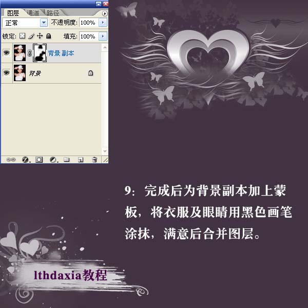 9、完成后为背景副本加上蒙版,将衣服用眼睛用黑色画笔涂抹,满意后合并图层。