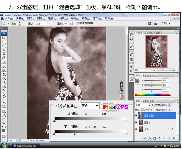 7、双击图层,打开“混合选项”面板,接ATL键,作如下图调节。