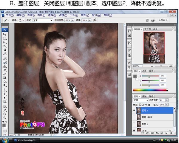 8、盖印图层,关闭图层1和图层1副本,选中图层2,降低不透明度。