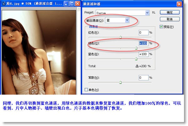 5、同理,我们切换到蓝色通道,用绿色通道的数据来修复蓝色通道,我们增加100%的绿色,可以看到,图片中人物裙子、墙壁出现白公,图片基本色调得到了恢复。