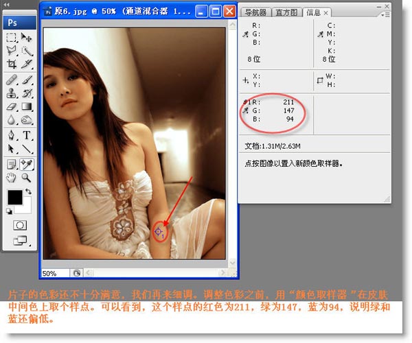 6、图片的色彩还不十分满意,我们再来细调,调整色彩之前,用“颜色取样器”在皮肤中间色上取个样点,可以看到,这个样点的红色为211,绿为147,蓝为94,说明绿和蓝还偏低。