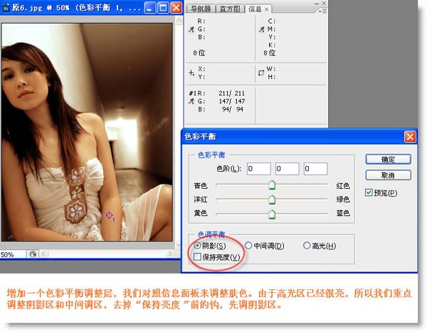 7、增加一个色彩平衡调整层,我们对照信息面板来调整肤色由于高光区已经很亮,所以我们重点调整阴影区和中间调区,支掉“保持高度”前的钩,先调阴影区。
