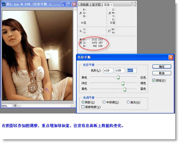 8、在阴影区作如图调整,重点增加绿和蓝,注意信息面板上数据的变化。