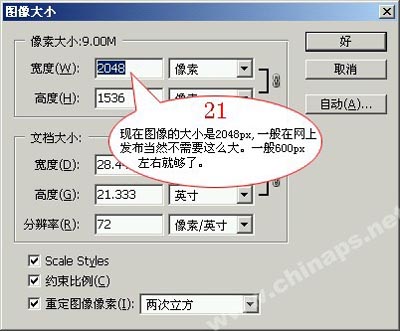 第21步:现在图像的大小是2048px,一般在网上发布当然不需要这么大。一般600px左右就够了。