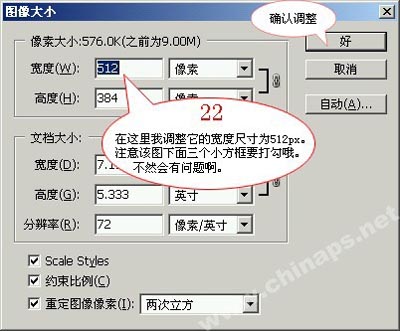 第22步:在这里我调整它的宽度尺寸为512px。注意该图下面三个小方框要打勾哦。不然会有问题啊。