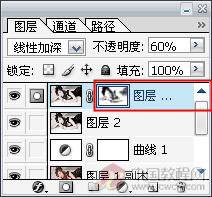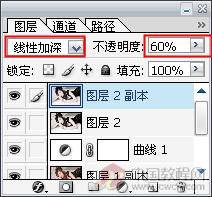 第5步:对图层2副本执行“滤镜/模糊/高斯模糊”,并把混合模式设为“线性加深”,不透明度设为60%。