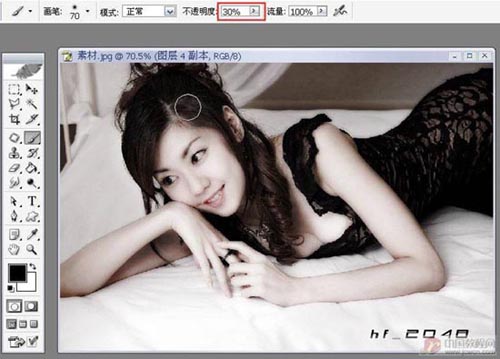 第6步:对图层2副本添加一个蒙板,并用黑色画笔,在需要还原的的方进行涂抹。涂抹时画笔的硬度设为最底,不透明度设为30%。我这里对头发和衣服涂抹了下。