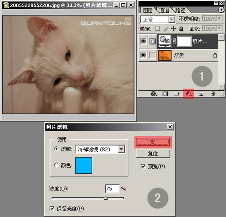 1、首先用PHOTOSHOP打开图片,鼠标单击标签1位置为图片添加一个“照片滤镜”调整图层。参照标签2调整其参数,并单击好按钮确定。