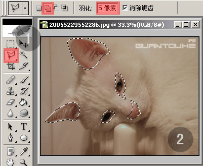 2、按键盘Ctrl+E将调整图层拼合,然后选择多边形套索工具参照标签1的参数,把猫猫的五官部分如标签2选择出来。