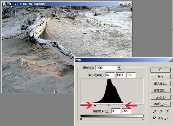1、调整图片的影调——选择——图像——调整——色阶,设置见图。