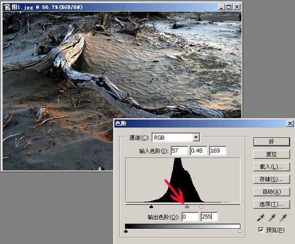 2、为了体现黄昏那种较暗的影调,再将中间灰滑标向右侧移动,整个片子的影调正常了,看图。