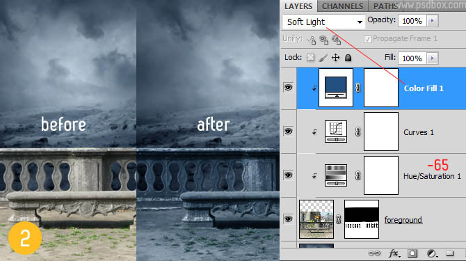 2、分别创建三个调整图层。第一个创建色相/饱和度调整图层,把饱和度设置为:-65,第二个曲线调整层压暗画面,最后用像使纯色填充层的颜色#21507f,混合模式为“柔光”。
