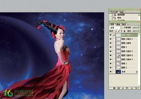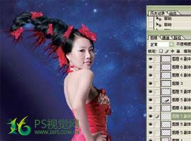 18、新建图层,将前景色设置成黄色,背景色为红色,在飘逸的裙纱上适当画出梦幻星星,最后打上自己需要表达的文字即可。