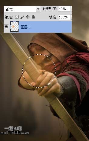 12、新建图层,1200像素柔角笔刷前景色#f59b3a在下图位置点一下,图层不透明度改为40%。