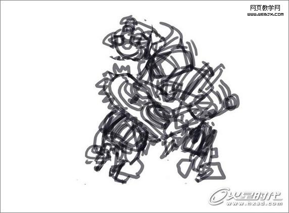 用线勾勒了一个大致的动态,然后就不停歇的一口气画了个大关系出来,其实这个大关系下体型和动态等也是不确定的,之后都做了几次修改,过程如下所示: