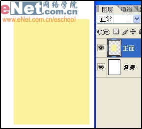 纸袋设计要尽量的大方、醒目。在设计纸袋时不要使用过于花哨的图案,淡雅、平和是纸袋设计的主流。新建大小为9cm×12cm的工作窗口,新建图层1,命名为正面。绘制一个矩形,然后填充淡黄色。