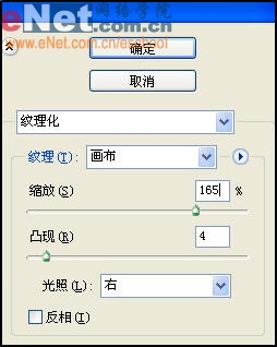 现在在菜单栏中执行“滤镜”→“纹理”→“纹理化”命令,设置纹理为画布,缩放为165%,凸现为4,光照为右。